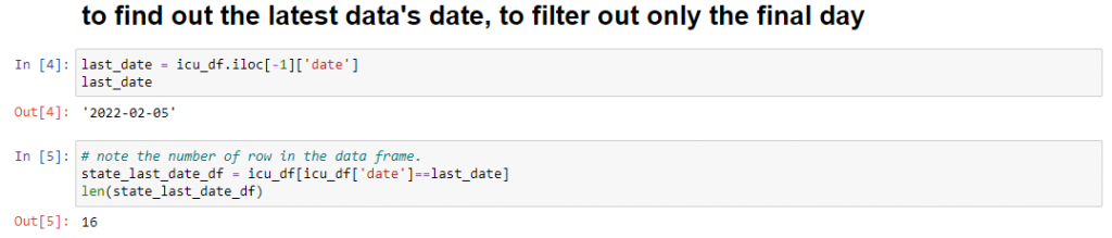Since MoH raw data was appended with daily data into the same CSV, I only need to get the data from the latest date. This is how i get the latest date. After getting the date, I filter the data frame so that I have smaller data set to work on. As you can see, the final data frame is only with 16 rows.