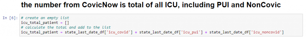 Referring to the number in Covicnow chart and also the data from Github, I figured out that they include all ICU patients into the calculation, that makes sense since we are counting the ICU bed utilization to see if any state or the country is running out of ICU bed, regardless the reason using the bed.
