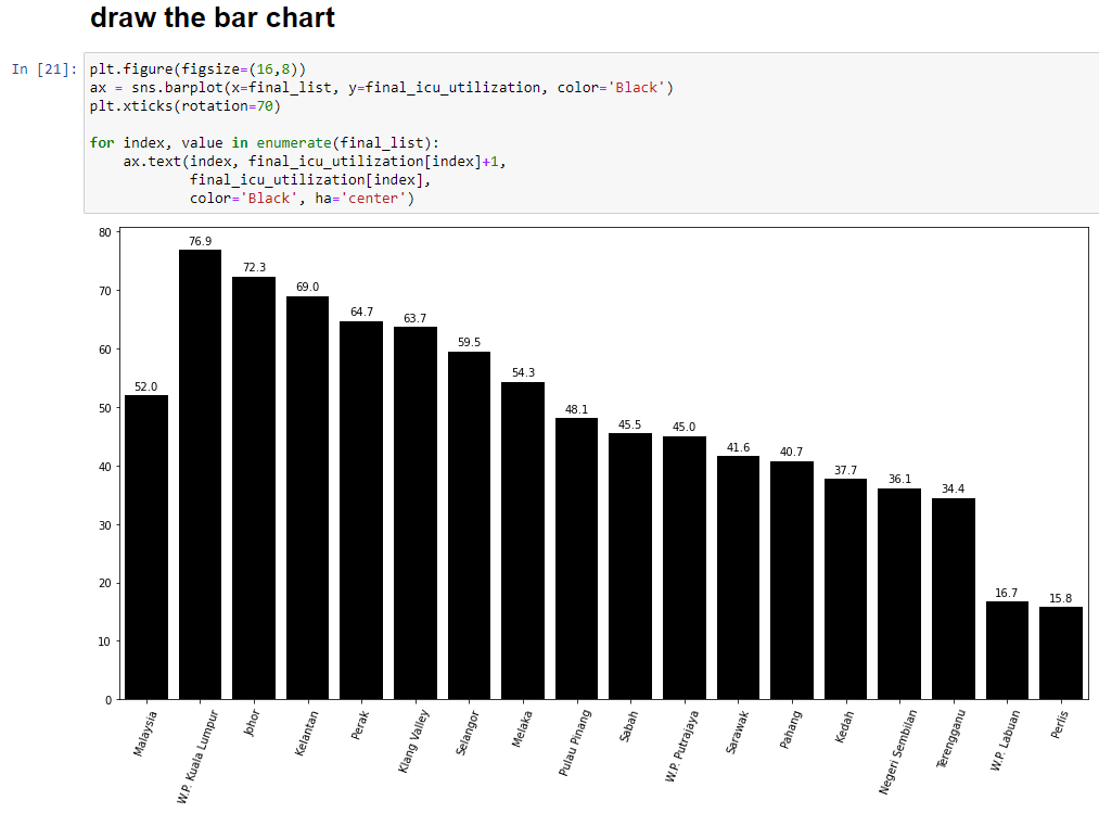 The chart uses the percentage, which is the total ICU patient over the total ICU bed. Also sort the data frame based on the utilization percentage, in descending order.