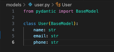 The data model is very simple, just to test out the functionality. Am using pydantic BaseModel to define the User class